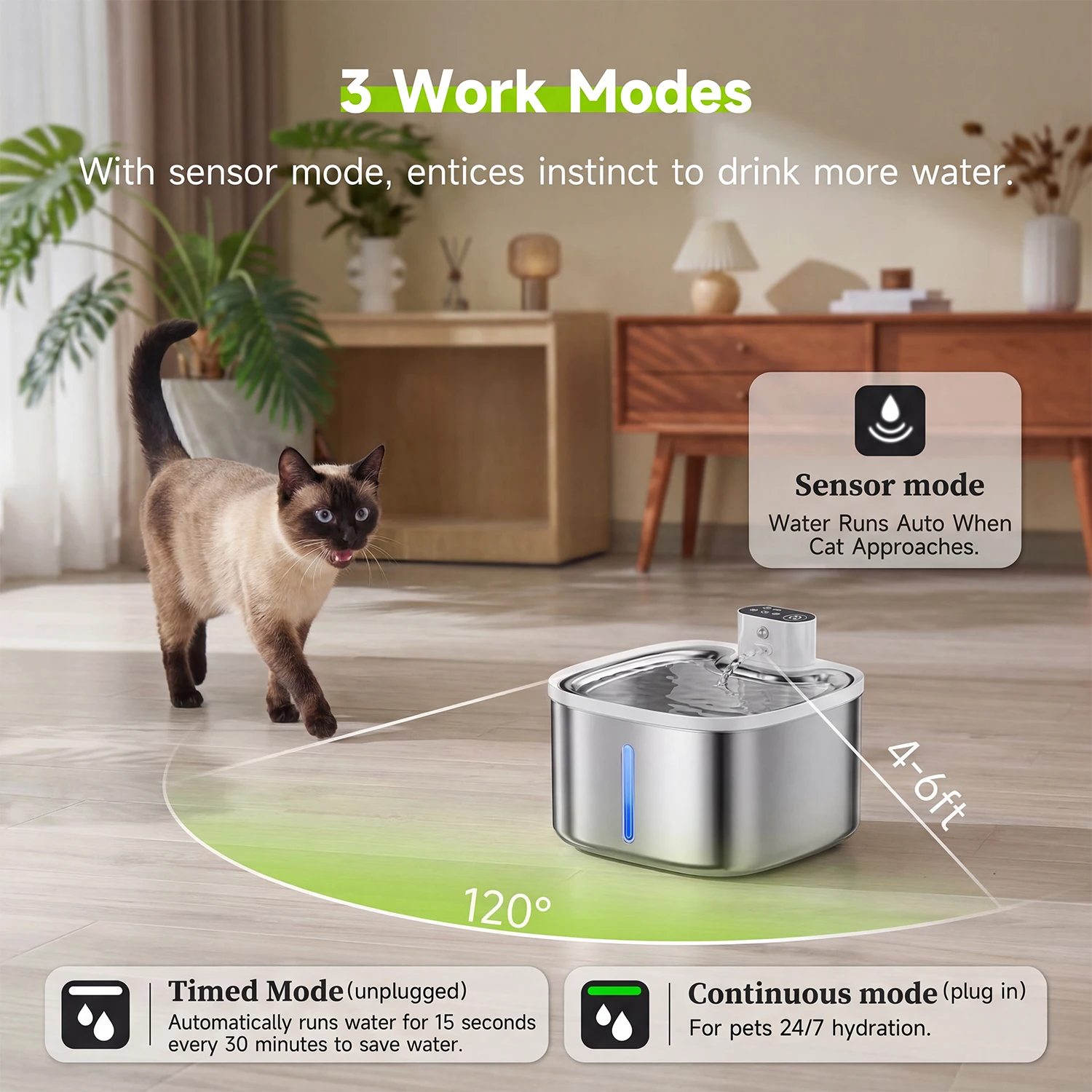Trois modes de débit d'eau pour vous et votre chat.